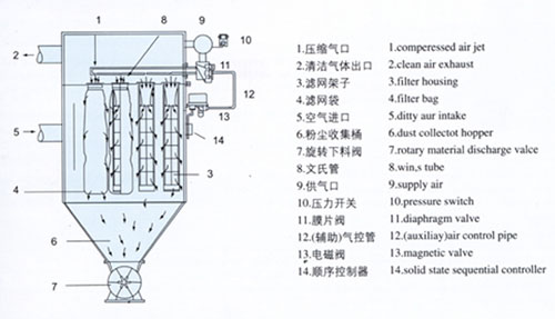 含塵氣流從進氣口進入下箱體后,部分沉降,輕微粉塵浮動時被濾袋阻留,凈化空氣透過濾袋,經(jīng)文氏管進入上箱體,從出氣口排出。積附在濾袋外壁的粉塵不斷增加,當阻力在限定(一般為80-120毫米水柱)的范圍內(nèi),就要清除積附在濾袋外壁的粉塵,清灰是由控制儀定期順序觸發(fā)各控制閥,開啟脈沖閥,使氣包內(nèi)的壓縮空氣由噴吹管孔噴出(一次風)通過文氏管誘導數(shù)倍于一次風的周圍空氣(二次風)進入濾袋,使濾袋在一瞬間急劇膨脹并伴隨著氣流的反向作用,被抖落的粉塵落入灰門經(jīng)排灰閥排出機體。