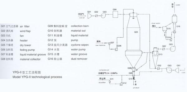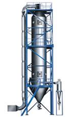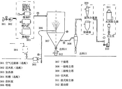 本機(jī)組工作過程為料液通過隔膜泵高壓輸入,噴出霧狀液滴,然后同熱空氣并流下降,大部分粉粒由塔底排料口收集,廢氣及其微小粉末經(jīng)旋風(fēng)分離器分離,廢氣由抽風(fēng)機(jī)排出,粉末由設(shè)在旋風(fēng)分離器下端的授粉筒收集,風(fēng)機(jī)出口處還可裝備二級(jí)除塵裝置,回收率在96-98%以上。