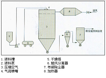 潔凈空氣加熱后進入干燥塔,在塔內(nèi)熱風(fēng)中用二流體(或三流體)噴嘴將各種料液物化成微小液滴,與熱風(fēng)進行快速熱交換,蒸發(fā)掉液料中的水分(或溶劑),并隨熱風(fēng)排出,得到粉狀產(chǎn)品。