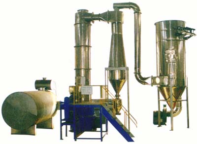 干燥氣體進(jìn)入干燥機(jī)底部,產(chǎn)生強(qiáng)烈的旋轉(zhuǎn)氣流,對器壁上物料產(chǎn)生強(qiáng)烈的沖刷帶出作用,消除粘壁現(xiàn)象。