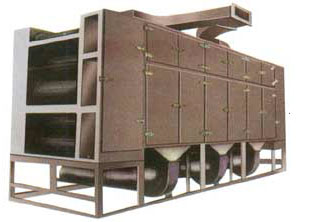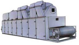 將所要處理的物料通過適當(dāng)?shù)募恿蠙C構(gòu),如星型布料器、擺動帶、粉碎機或造粒機,分布在輸送帶上,輸送帶通過一個或幾個加熱單元組成的通道,每個加熱單元均配有空氣加熱和循環(huán)系統(tǒng),每一個通道有一個或幾個排濕系統(tǒng),在輸送帶通過時,熱空氣從上往下或從下柱上通過輸送帶上的物料,從而使物料能均勻干燥。